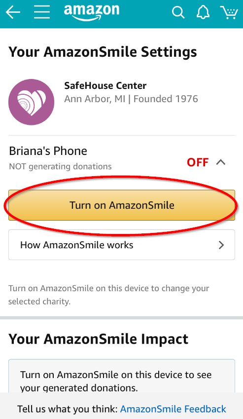 In a few months it will be the holidays and due to COVID-19, many people will be shopping online at Amazon. Set your Amazon homepage to this URL from now on. And if you use the Amazon app on your phone, just go into “Settings” to enable AmazonSmile donations (screenshots below; you have to do it manually even if you already set it up on your computer browser).