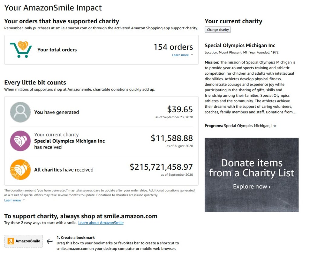 AmazonSmile is available at smile.amazon.com and is the exact same website and products as you’re familiar with, with the added benefit that Amazon will donate 0.5% of your purchases to the charity of your choice. They have over one million organizations to choose from.