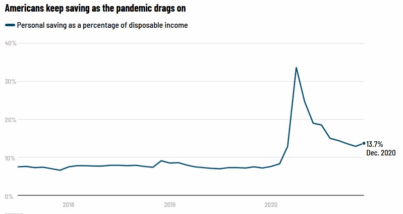 Consumer spending plummeted in 2020 with nowhere to go and many folks now have record-high savings thanks to stimulus checks and permanent wage increases for lower income earners.
