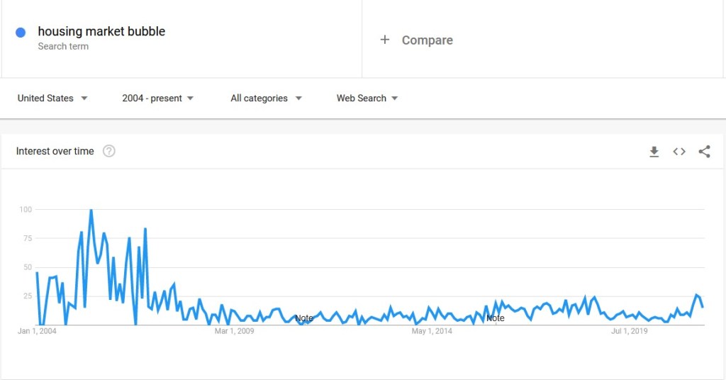 Google Trends seems to validate my opinion. Here’s a graph of the number of people searching for the term “housing market bubble” in the United States: