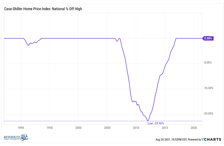And house prices usually appreciate. Just look at this chart from Ben Carlson of downturns in the housing market. There’s only been 2 in the past 30 years: