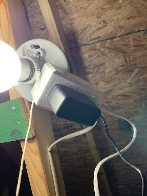 I moved my miner into my attic for now until I can install a more permanent and powerful antennae on my roof. I installed a simple light bulb with an outlet and then used an Ethernet over Electric connection to connect the hotspot. I zipped everything together to keep it secure.