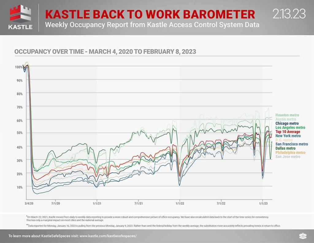 Another interesting factor in the price of homes is related to the other place we spend a majority of our time: the office. Take a look at this chart, courtesy of Kastle Systems:
