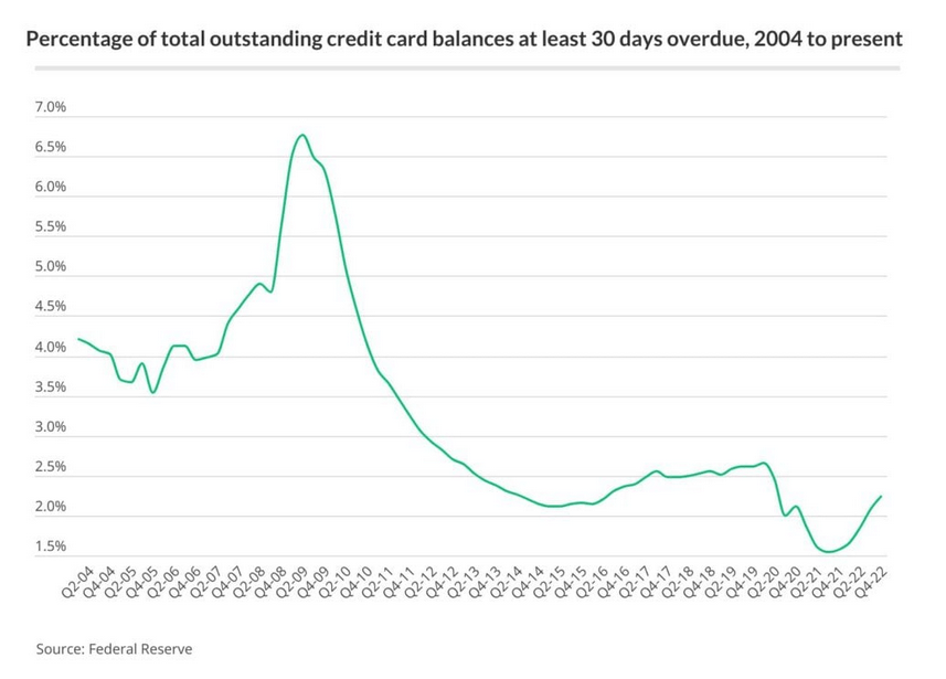 For all the talk of layoffs and recessions in the headlines over the past 12 months, it sure isn’t showing up in the data. Consumers are having no problem paying their credit card balances. Overdue credit card loans are still very low compared to the previous economic boom and bust (the global financial crisis).