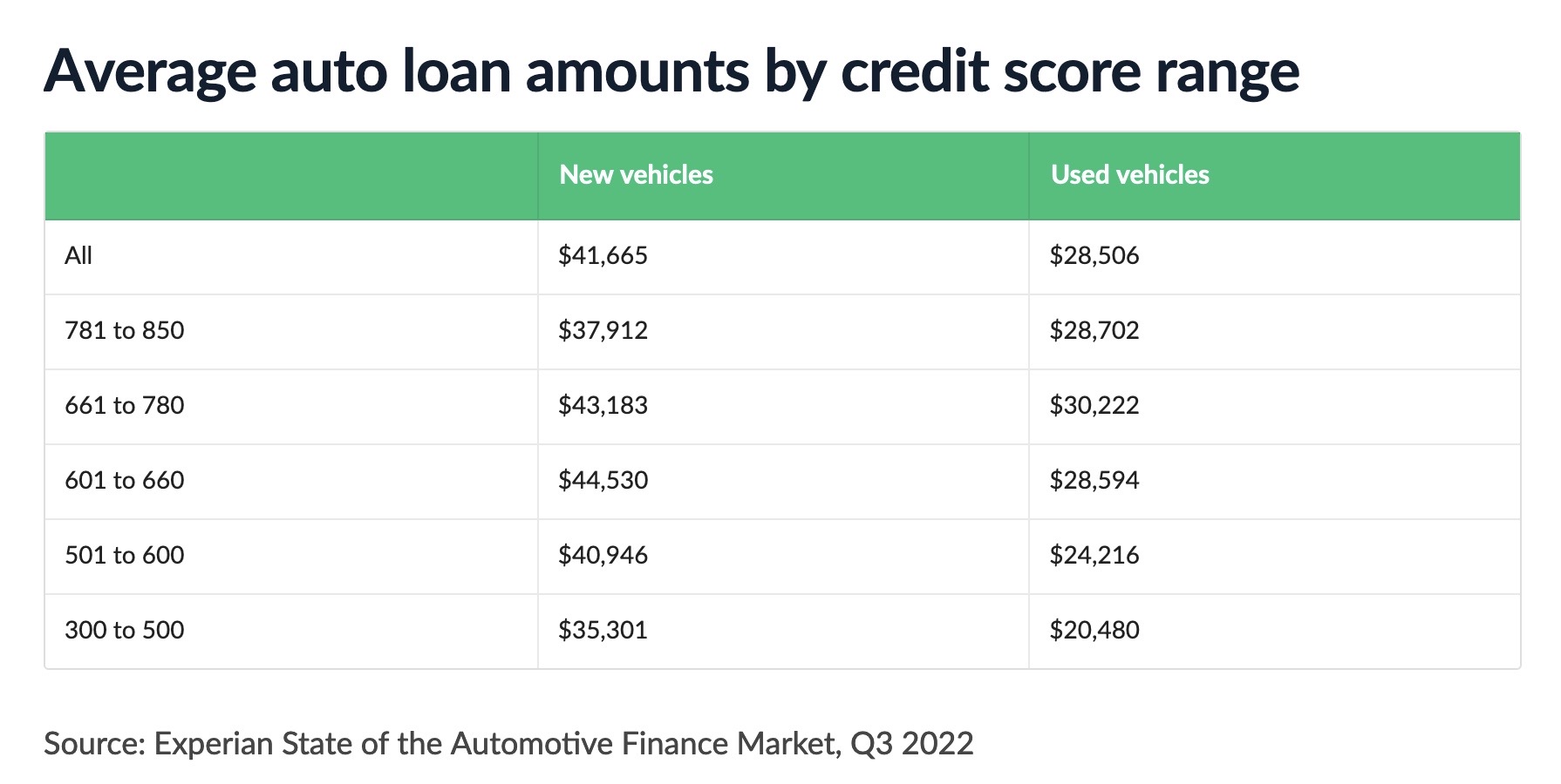 Here we see that the highest loans on new vehicles are being taken out by people with a credit score of 601-660. That’s not a bad credit score, per se, but it’s certainly not great as it may signify low down payments, late payments, or a propensity to finance one’s life with debt.