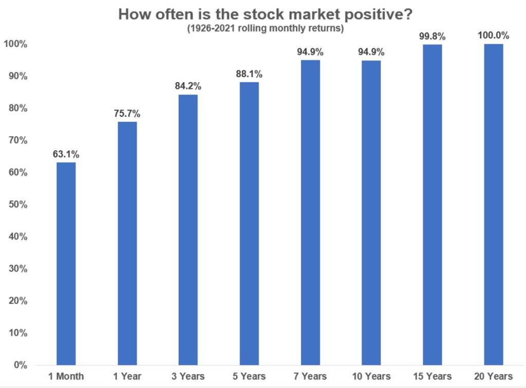 Statistically speaking, “long enough” is about 15 years according to this chart, which shows the stock market has never lost you money if you hold your investments for at least 15 years: