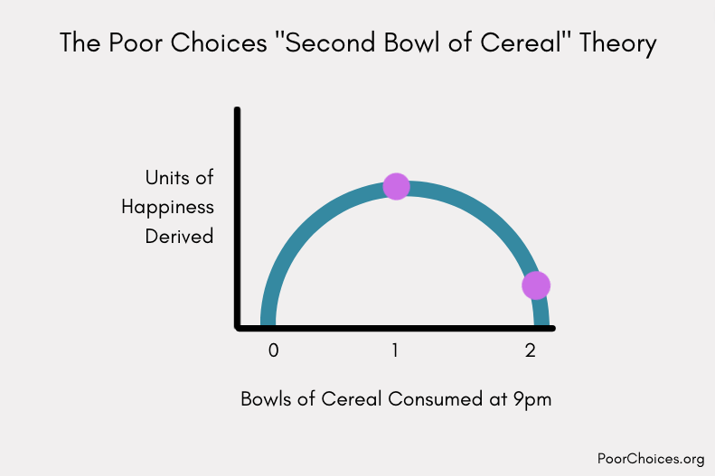 This is due to a principle called “diminishing marginal utility”. The second bowl of cereal provides far less utility (the economic term for happiness) than the first. A third bowl of cereal would just be blasphemous and we won’t even speak of it.