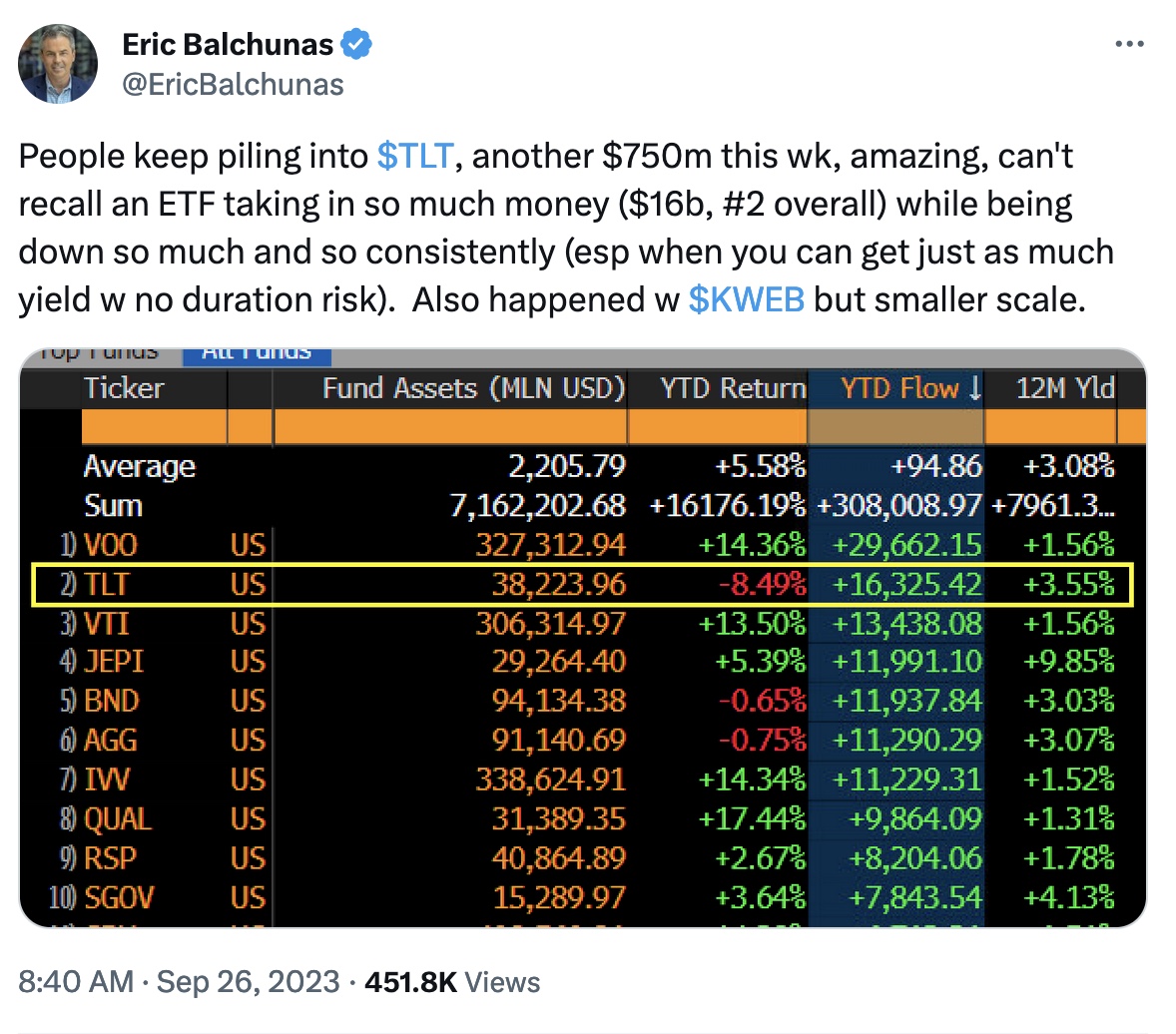 The above chart shows YTD flows for various ETFs. As you can see, TLT has taken in A LOT of money over the past year. The fund now has over 40 billion dollars in it.