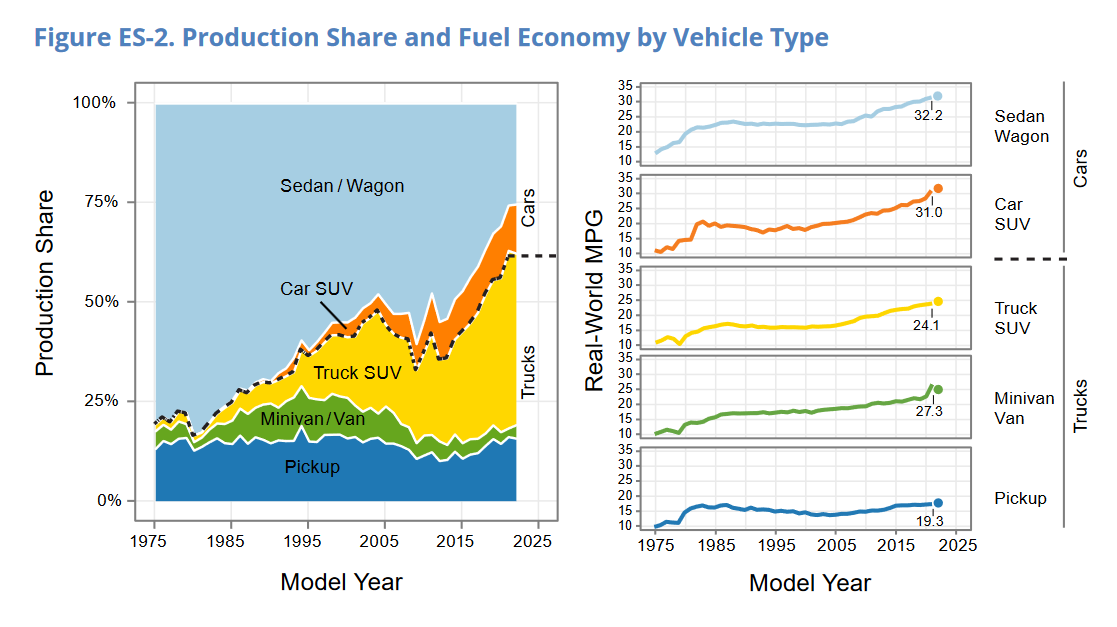 For example, in 1990, the average miles per gallon for a standard light-duty passenger vehicle was 23 mpg. Today that number is about 32. We created more fuel-efficient cars. This was due to a combination of policies, consumer preferences, and manufacturer innovations.