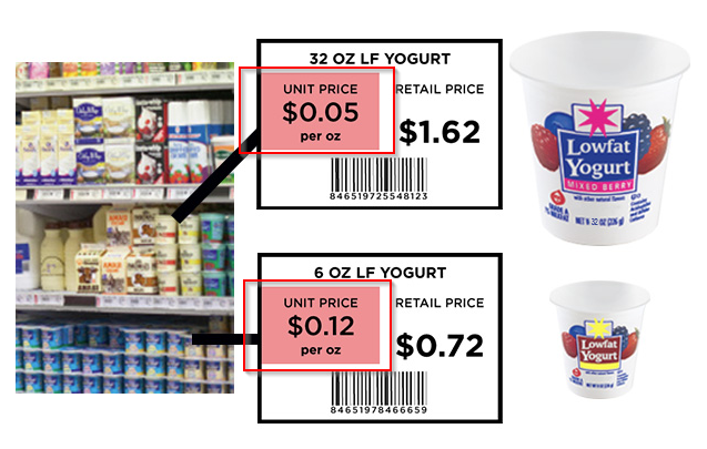 When you are at the grocery store looking at two different sizes of something, they will often list the price of the item, and then a smaller price below it indicating the price per weight or price per unit. It looks like this: